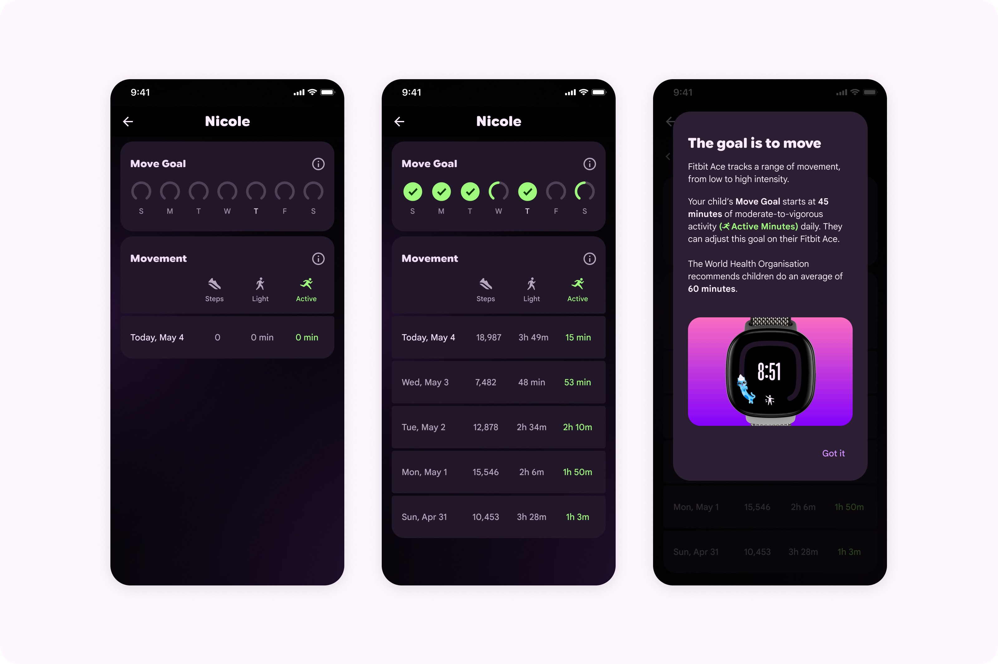 To help parents see how much their child was moving, as a way to both encourage healthy habits and reinforce that the watch was doing its job keeping kids active, we designed a simple, scannable activity dashboard that showed: