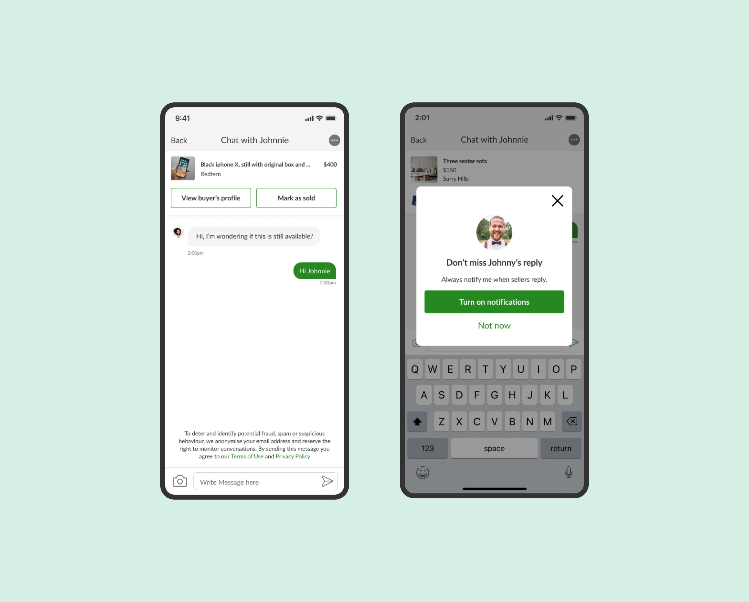 Message sent prompt – A prompt after sending a message encouraged enabling notifications for replies. User testing participants said that they would be inclined to to turn this notification on and that it did not feel spammy.
